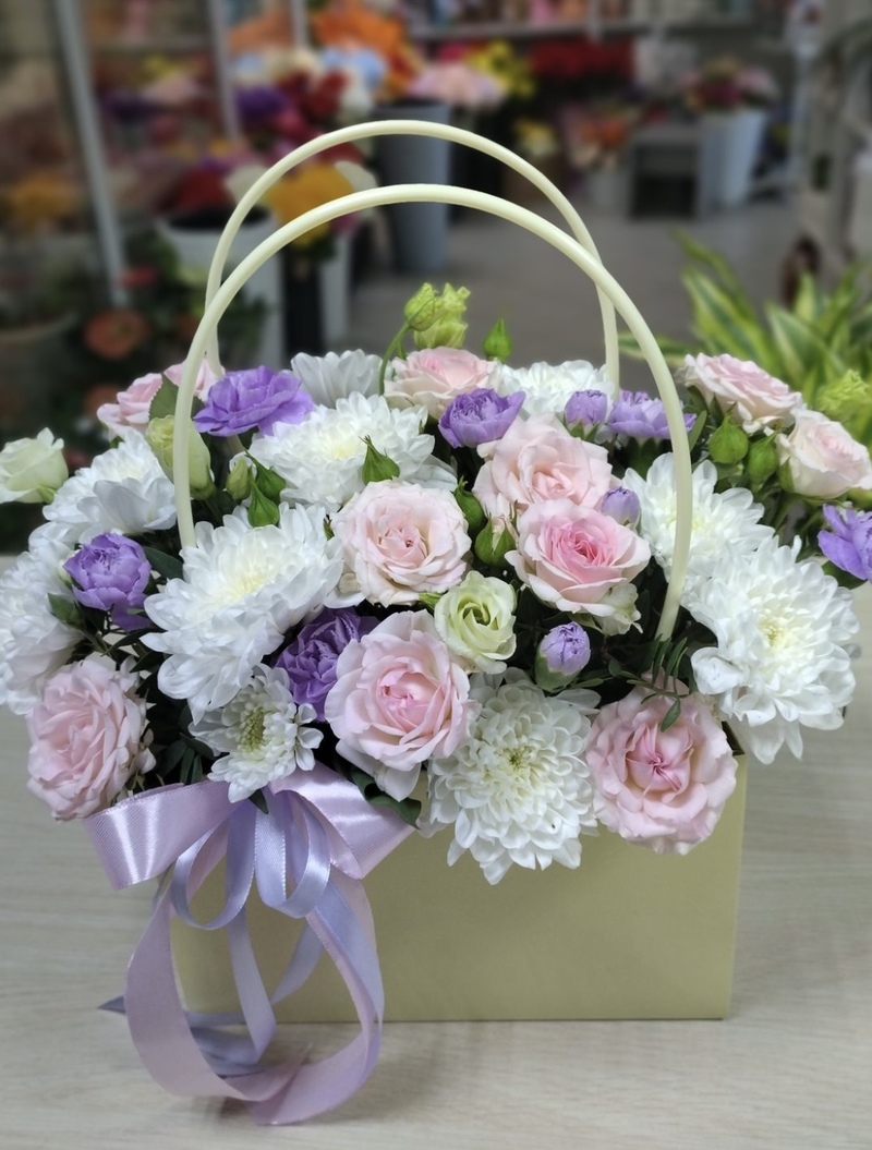 В состав композиции входят: хризантема, роза кустовая, диантус.